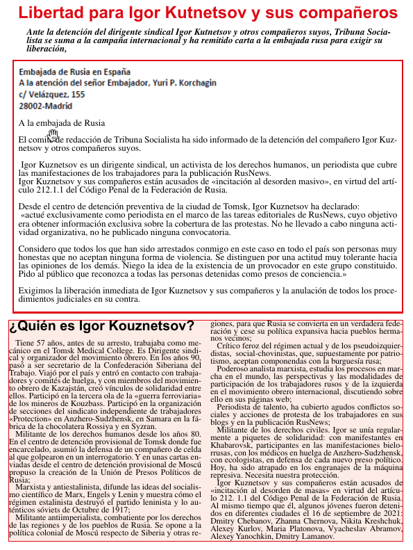 Libertad para Igor Kutnetsov y sus compañeros. Si estás de acuerdo, comparte. Haz clic para compartir en X (Se abre en una ventana nueva) X Haz clic para compartir en Facebook (Se abre en una ventana nueva) Facebook Me gusta Cargando... Relacionado Autor: Tribuna Socialista Tribuna libre de expresión. Fomentando el debate y las propuestas entre socialistas. Lee todas las entradas de Tribuna Socialista