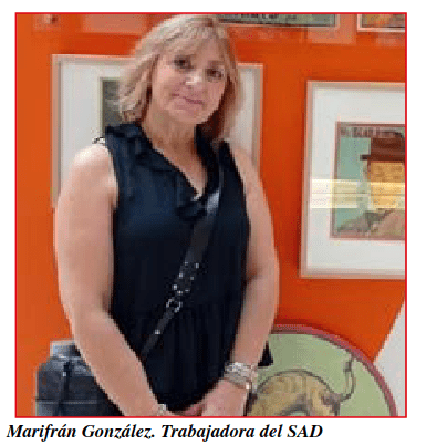 Marifrán González es trabajadora del Servicio de Ayuda a Domicilio (SAD) en Valencia, desde 2012, antes estuvo en hospitales y residencias como auxiliar. Desde 2019 es representante de sus compañeras de trabajo por la UGT Servicios Públicos y forma parte de la Asociación de profesionales del SAD en la Comunitat Valenciana; Asociación con la que ha participado y organizado movilizaciones y diversas acciones para reclamar mejores condiciones de trabajo para el colectivo.