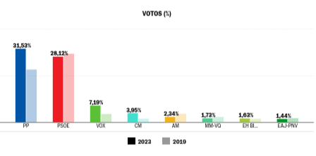 Los resultados tienen un denominador común: el ascenso de PP y VOX. Ell PP ha obtenido 1.988.092 votos que se nutren de 1.574.707 que han dejado de recibir las candidaturas de Ciudadanos, más los 368.212 que han dejado de votar al PSOE y que probablemente han migrado al PP.