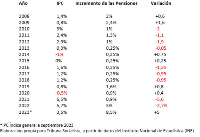 Recodemos que el movimiento de pensionistas viene defendiendo el mantenimiento del poder de compra de las pensiones desde que el gobierno de Rajoy (PP), aplicase una ripia subida del 0,25% entre los años 2013 y 2018, ambos inclusive, como puede verse en la siguiente tabla: