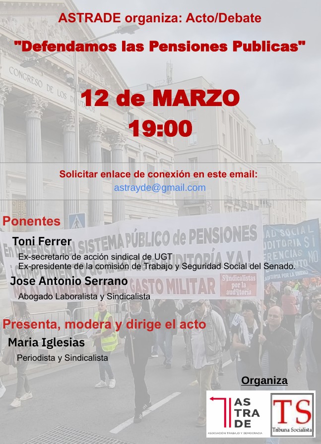 Debate 12 de Marzo: Defendamos las Pensiones Públicas Para descargar en PDF: Charla Debate 12 de Marzo Si estás de acuerdo, comparte. Compartir en X (Se abre en una ventana nueva) X Comparte en Facebook (Se abre en una ventana nueva) Facebook Me gusta Cargando... Relacionado Autor: Tribuna Socialista Tribuna libre de expresión. Fomentando el debate y las propuestas entre socialistas. Lee todas las entradas de Tribuna Socialista