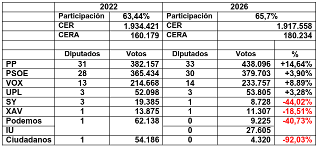 Podemos-IU se presentaron en coalición en 2022, obteniendo un diputado con 62.138 votos. En las elecciones del pasado domingo se presentaron por separado, obteniendo 9.225 votos Podemos y 27.605 IU, experimentando una pérdida conjunta de votos del 40,73% en la comparativa con 2022. La consecuencia es que ambos se han quedo fuera de las Cortes de Castilla y León.