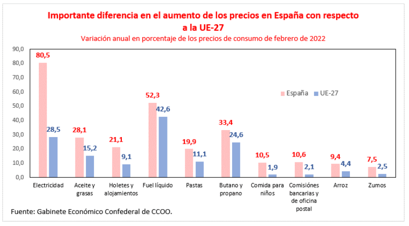 Según el gabinete económico confederal de CCOO, los precios al consumo han aumentado más en España que en el resto de la Unión Europea (ver gráfico 1). La razón está en una excesiva dependencia energética del gas, y del lucrativo negocio que el sector energético supone para las multinacionales quienes actuan en régimen de oligopolio y especulan a su antojo. Quienes pagamos su “fiesta de los beneficios”, otros lo llaman “pa la saca”, somo los trabajadores, que vemos como cierran nuestras empresas, temporal o definitivamente, por no poder hacer frente al aumento de la energía y materias primas. Vemos como el empleo, sobre todo industrial, pierde peso, y vemos como los precios de nuestra cesta de la compra se disparán, mientras que con nuestros salarios y pensiones cada vez cuesta más llenar el carrito.
