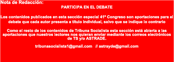 Abrimos en este número de Tribuna Socialista una sección especial congreso del PSOE que se mantendrá activa hasta su celebración. Una sección en la que los socios y socias de ASTRADE así como los lectores de TRIBUNA SOCIALISTA podrán publicar aquellos contenidos de relevancia para mejorar los derechos y libertades de la clase trabajadora de este país