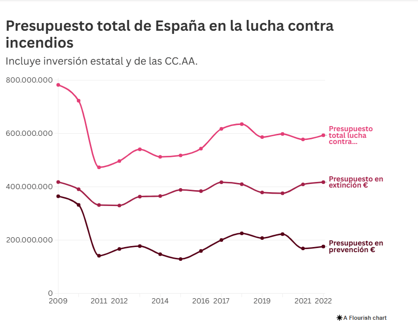 Este mes de agosto hemos vivido las evidentes consecuencias del abandono de las políticas de inversión pública. Hasta el 7 de septiembre 341.203 hectáreas quemadas (según el Ministerio para la Transición Ecológica y el Reto Demográfico), el mayor número de la serie histórica, y que las distintas administraciones achacan al cambio climático, a los pirómanos, a la España vaciada, a lo que convenga para no señalar lo evidente: no hay recursos, ni bomberos, ni prevención, los medios están obsoletos, y tampoco hay dinero que dedicar a lo público. Hoy mismo (24 de septiembre) bomberos y agentes forestales convocan a toda la sociedad a una manifestación en Valladolid para pedir estabilidad laboral y aumento de recursos. Consideran la gestión forestal inadecuada y sujeta a intereses privados.