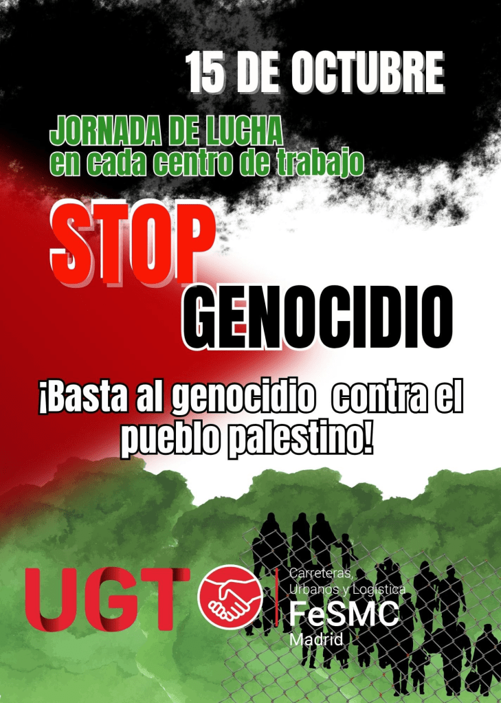 El 15 de octubre se llevó a cabo una jornada de lucha por Palestina en todo el Estado español. En esta ocasión, las confederaciones sindicales de UGT y CCOO se unieron a las movilizaciones convocando paros parciales de dos horas en cada turno de trabajo dando cobertura legal a las asambleas, concentraciones u otras acciones y actividades que se pudiesen desarrollar en los centros de trabajo y empresas.