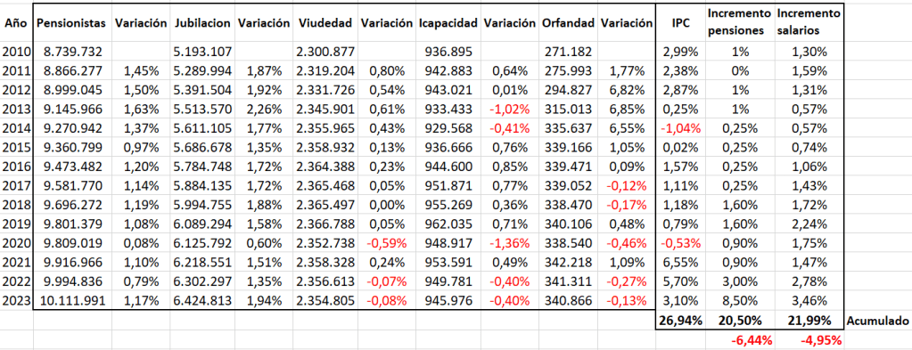 1º) Cuando las pensiones recuperen el poder adquisitivo perdido, que en el periodo 2010 a 2023 acumulan una pérdida del 6,44% (ver cuadro), pérdida provocada por los cuatro años (2014 a 2017, ambos inclusive) en los que el Gobierno del PP revalorizó las pensiones al 0,25% cada año. Y por la alta inflación de los años 2021 y 2022, en los que el IPC se situó en el 6,55 y 5,7% respectivamente.