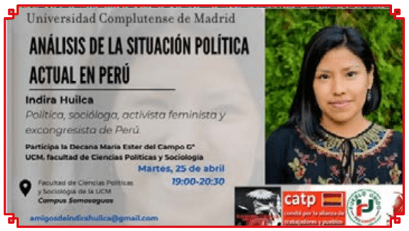 En su intervención, Indira Huilca comenzó señalando que la crisis desatada en Perú en el pasado mes de diciembre no ha sido superada, aunque en estos momentos se trasmita una situación de calma por parte del Gobierno asesino de Dina Boluarte. Una presidenta que ha llegado al poder apoyándose en la Constitución fujimorista de 1993 y en un contexto político muy deteriorado.