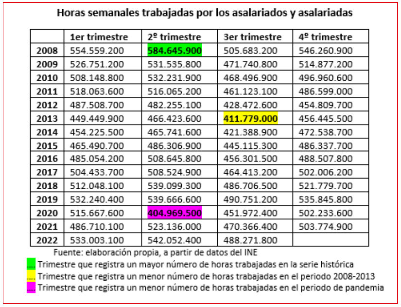 La grafica anterior representa la media trimestral anual, sin distinguir trimestres. Destaca que en 2013 las horas trabajadas cayeron aún más que durante el año 2020, el peor año de pandemia. Este dato cuantitativo hay que relacionarlo con la gran destrucción de empleo que provocó la reforma laboral de 2012, no derogada en todos sus efectos lesivos, cuyas medidas desembocaron en la mayor tasa de paro registrada en la historia de nuestro país, el 26,06% en el 2º trimestre de 2013. Aquella reforma laboral fue una tremenda operación para la transformación trabajo con derechos en empleo precario.
